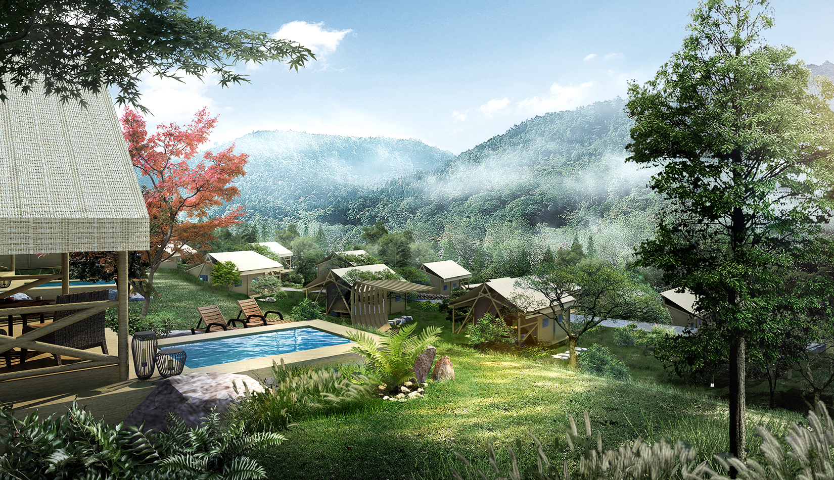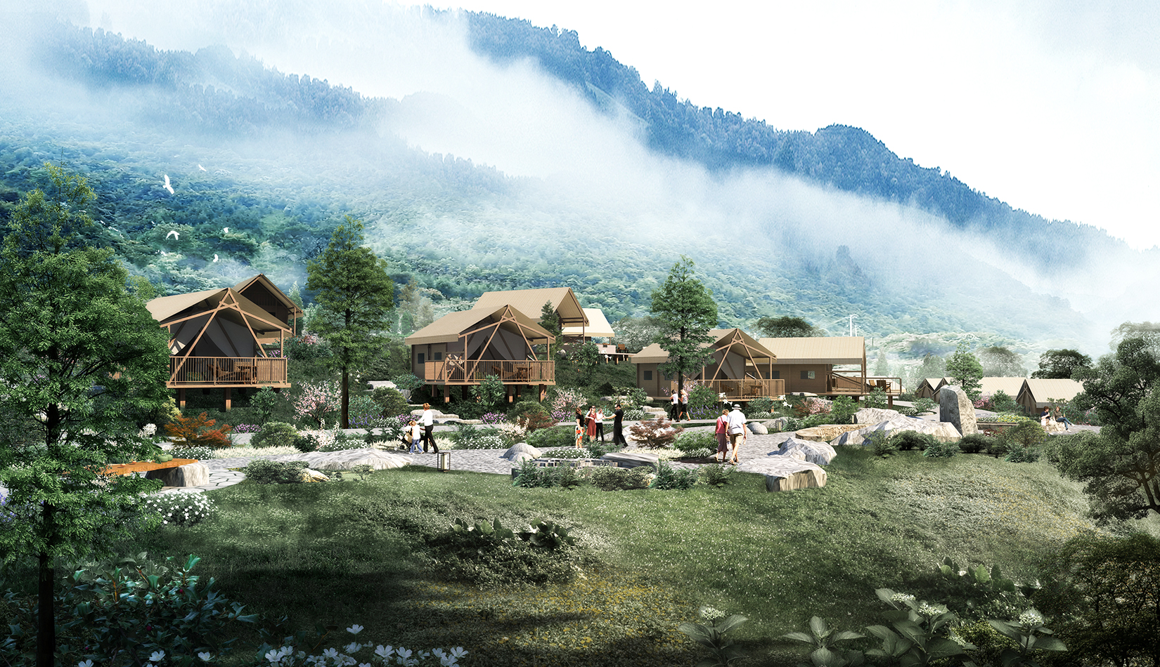 根據(jù)基地的地勢(shì)分布及功能需求,空間結(jié)構(gòu)上分為“一帶兩軸三核心五組團(tuán)”。建筑設(shè)計(jì)的五個(gè)組團(tuán),分別是濱水休閑組團(tuán)、水畔風(fēng)光帳篷組團(tuán)、高端養(yǎng)心帳篷組團(tuán)、中心服務(wù)組團(tuán)及山居野趣帳篷組團(tuán)??头坎糠植捎脦づ穸燃傥莸姆绞?,凸顯野奢度假的浪漫形式。