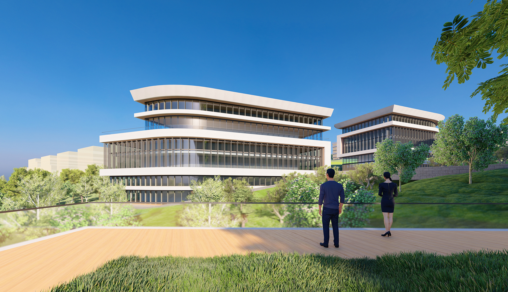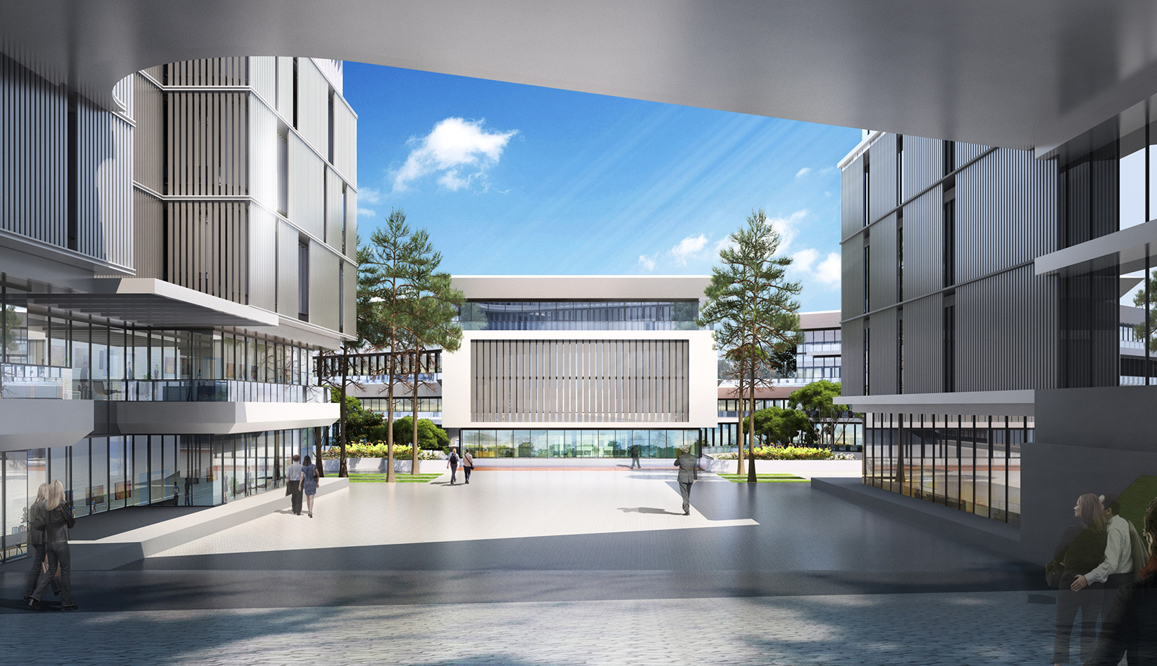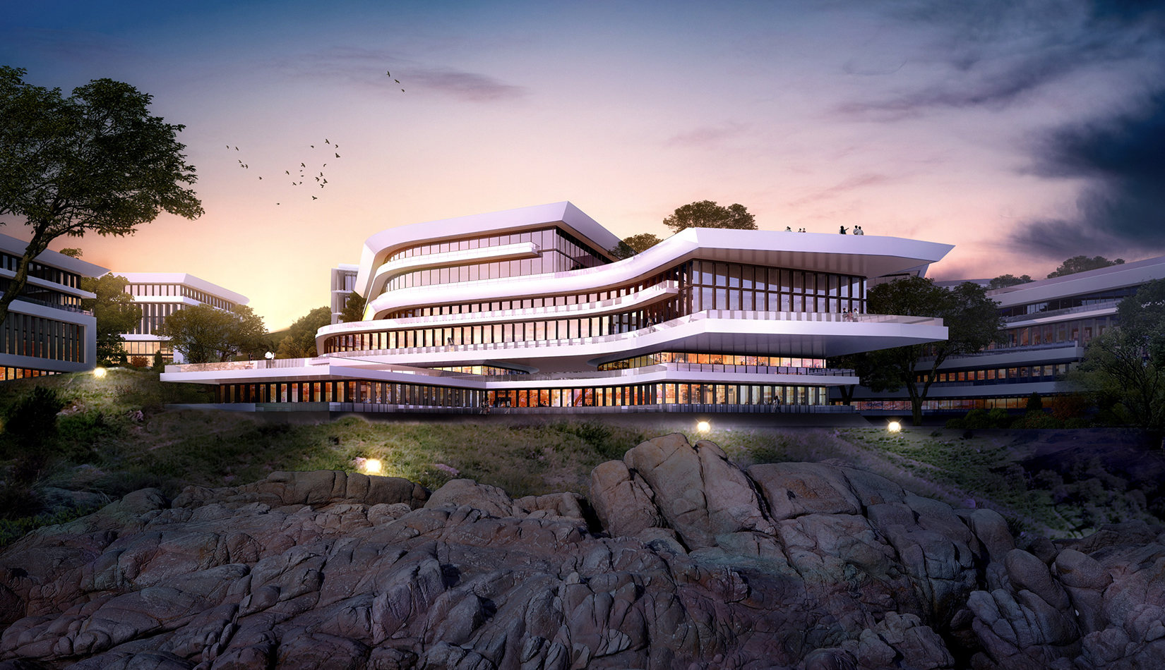建筑立面采用疏密有致的格柵化立面,凸顯了預警基地的嚴肅性;白色流線型屋頂順應地勢,給建筑賦予現(xiàn)代的海洋氣息。不同的建筑功能合理布局,沿海建筑采用退臺的建筑手法,沿海岸線立面生動活潑。
