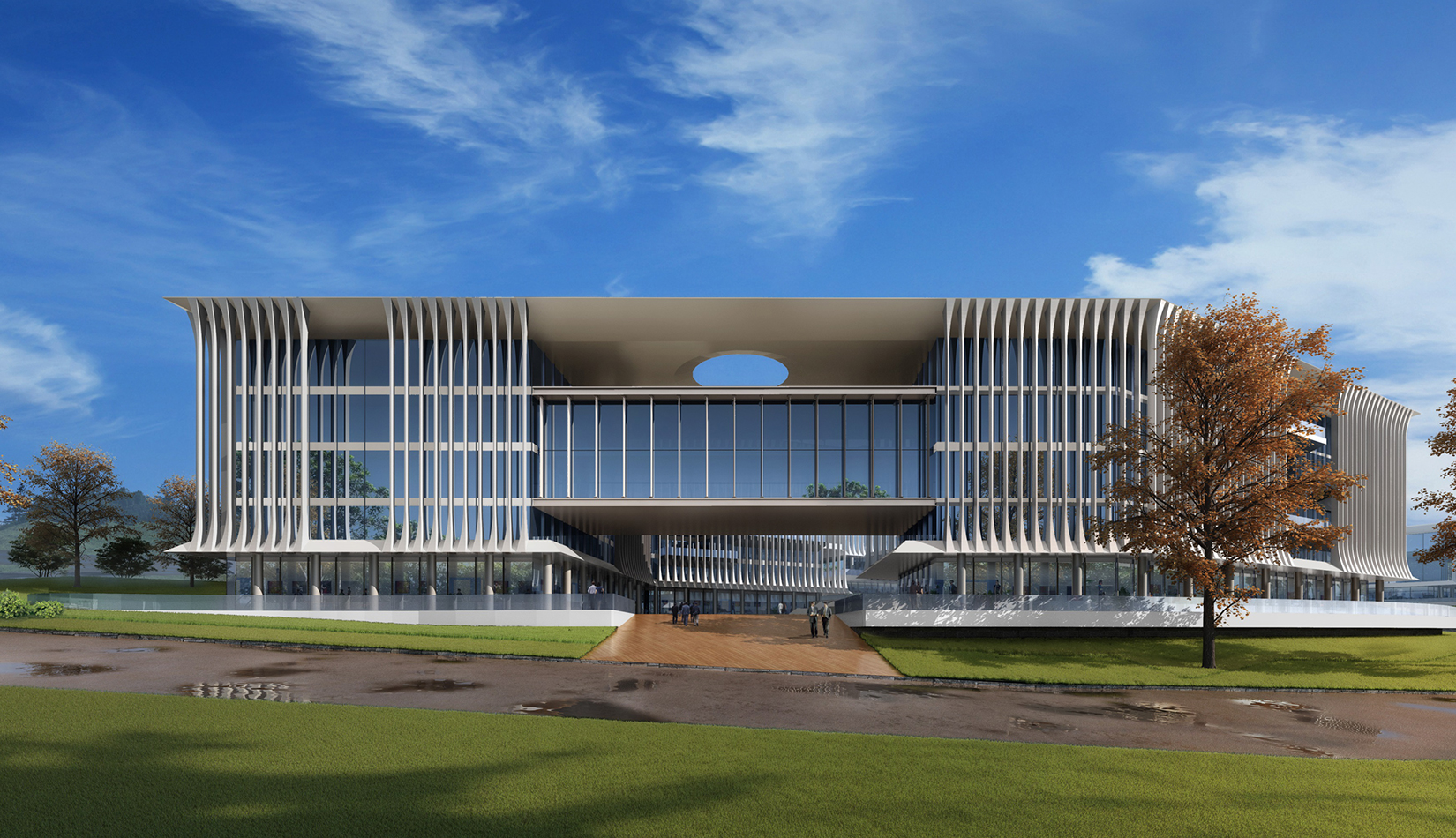 簡潔大氣的豎向橫向劃分,使MECS主樓充滿海洋氣息;白色流線型屋頂順應地勢,自由舒展。流線型的體塊靠近海岸線,表達科研人員的探索精神,并且與地勢相結(jié)合。
