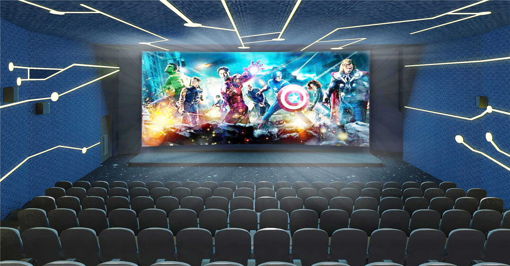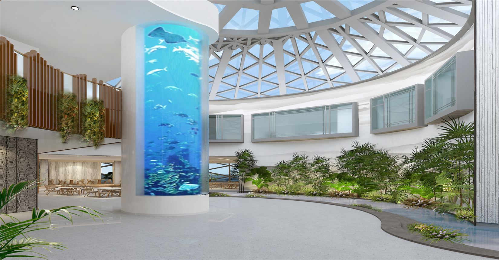 電影院在內(nèi)部空間造型設(shè)計上延續(xù)建筑外立面海螺鋼結(jié)構(gòu)美感,以連貫性曲線為特征,做到內(nèi)外形式美感相呼應(yīng)。以白色金屬板材、白色系魔石地坪及綠色植物垂直造景墻面為主材,全方面打造契合濕地文化主題的生態(tài)景觀體系影城。